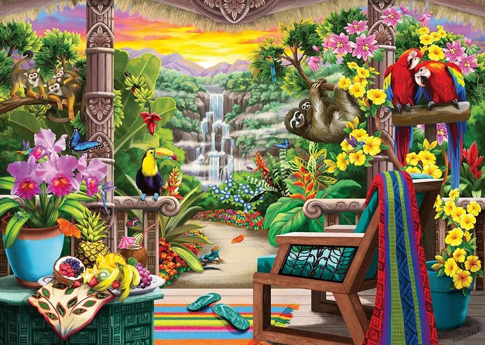 Tropical Retreat 1000-piece puzzle brings lush, paradise scenery with vibrant colors. Detailed artwork and smooth-fitting pieces offer relaxing escape. Completed puzzle transports you to serenity – great for nature lovers or brightening rooms with exotic beauty.